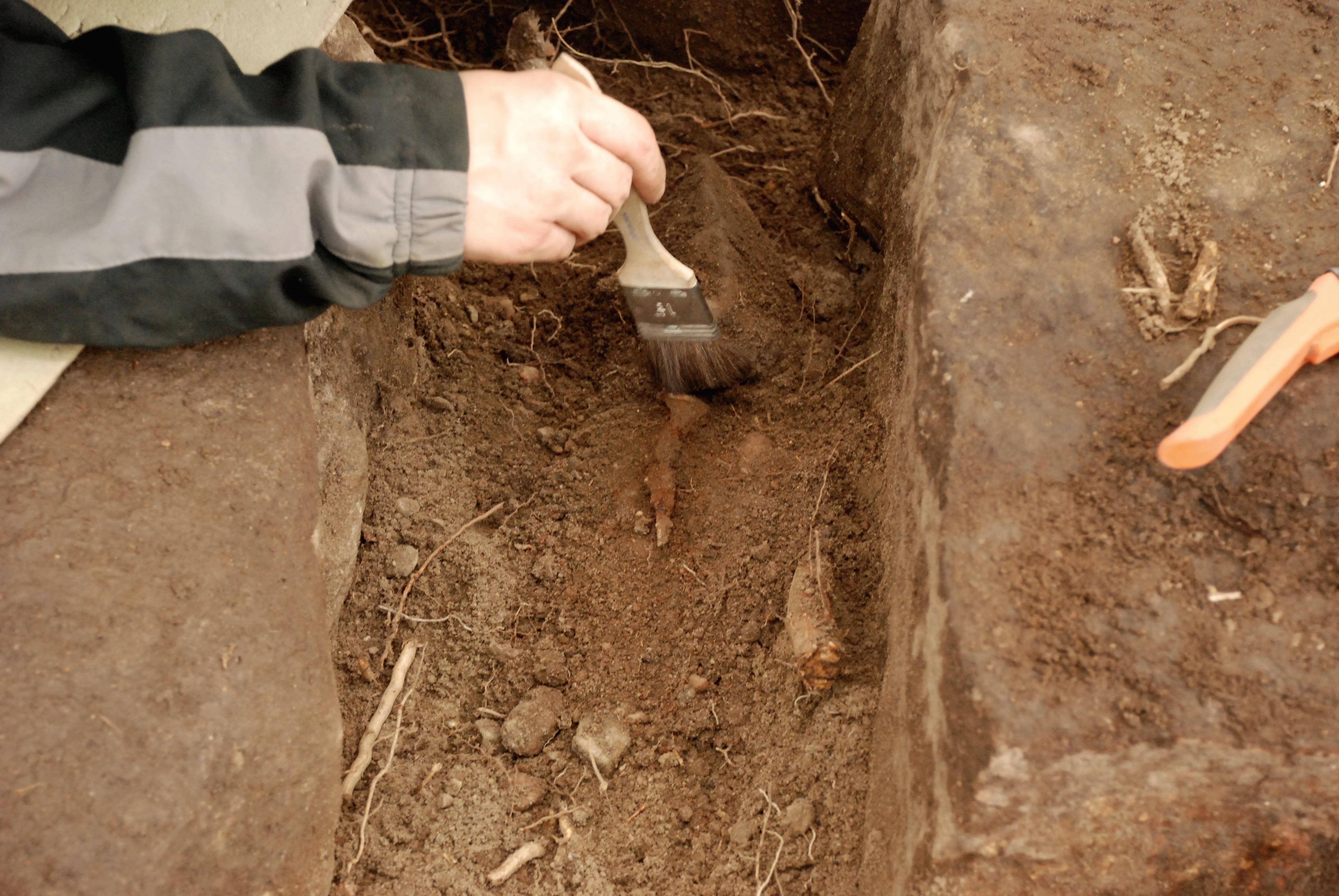 Löytyneen kivijalan kohdalta kaivetaan varovasti esiin kirkkorakennukseen kuulunutta rautanaulaa. Kuva: J. Ruohonen.
