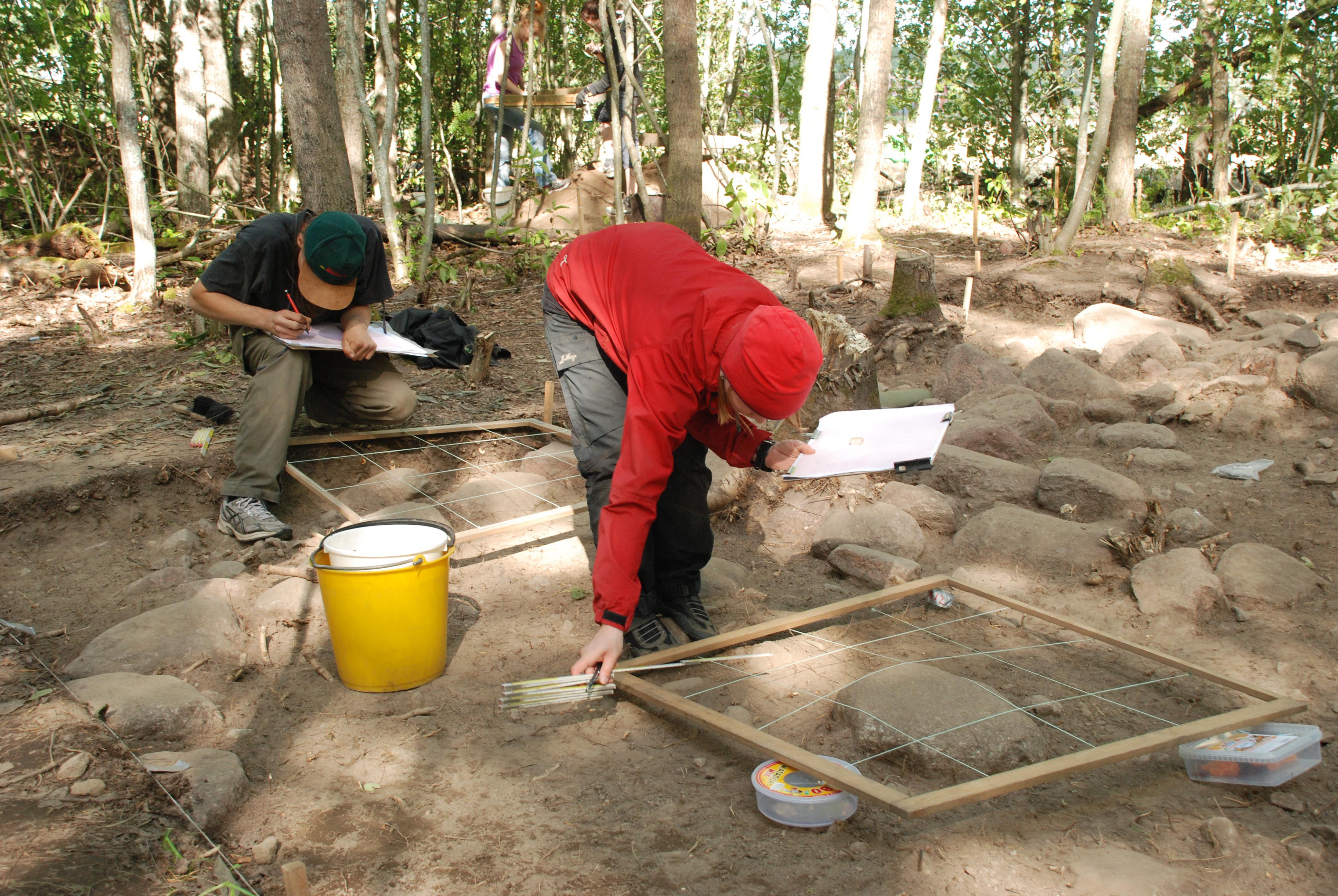 Arkeologian opiskelijat harjoittemassa kivijalan piirtämistä millimetripaperille. Kuva: J. Ruohonen.